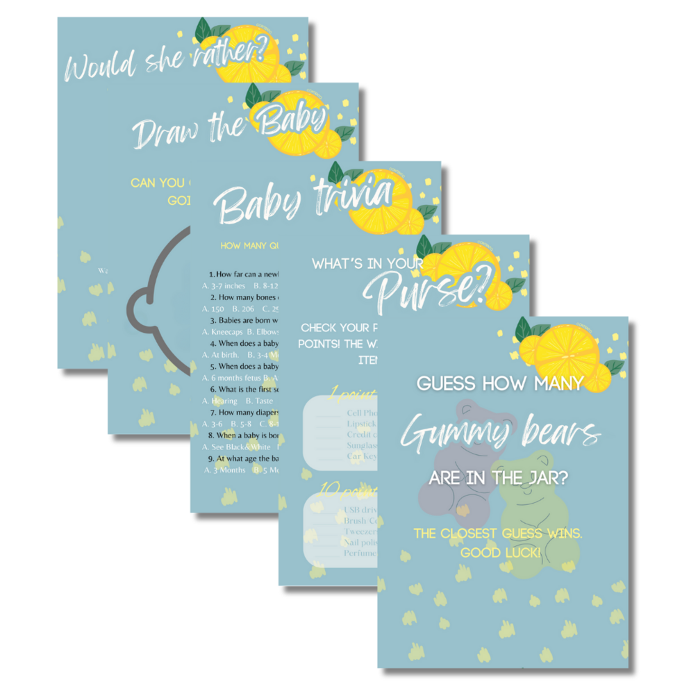 The package includes a playful invitation that sets the tone for a joyous gathering. Additionally, it offers nine customizable games to keep your guests entertained and engaged. Let the zesty Lemon Vibes add a burst of positivity and happiness to your baby shower.