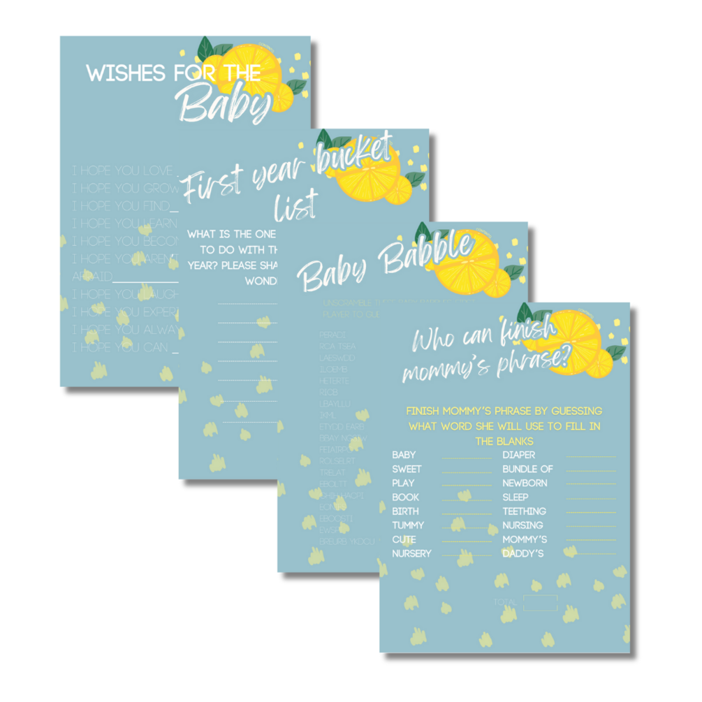 The package includes a playful invitation that sets the tone for a joyous gathering. Additionally, it offers nine customizable games to keep your guests entertained and engaged. Let the zesty Lemon Vibes add a burst of positivity and happiness to your baby shower.