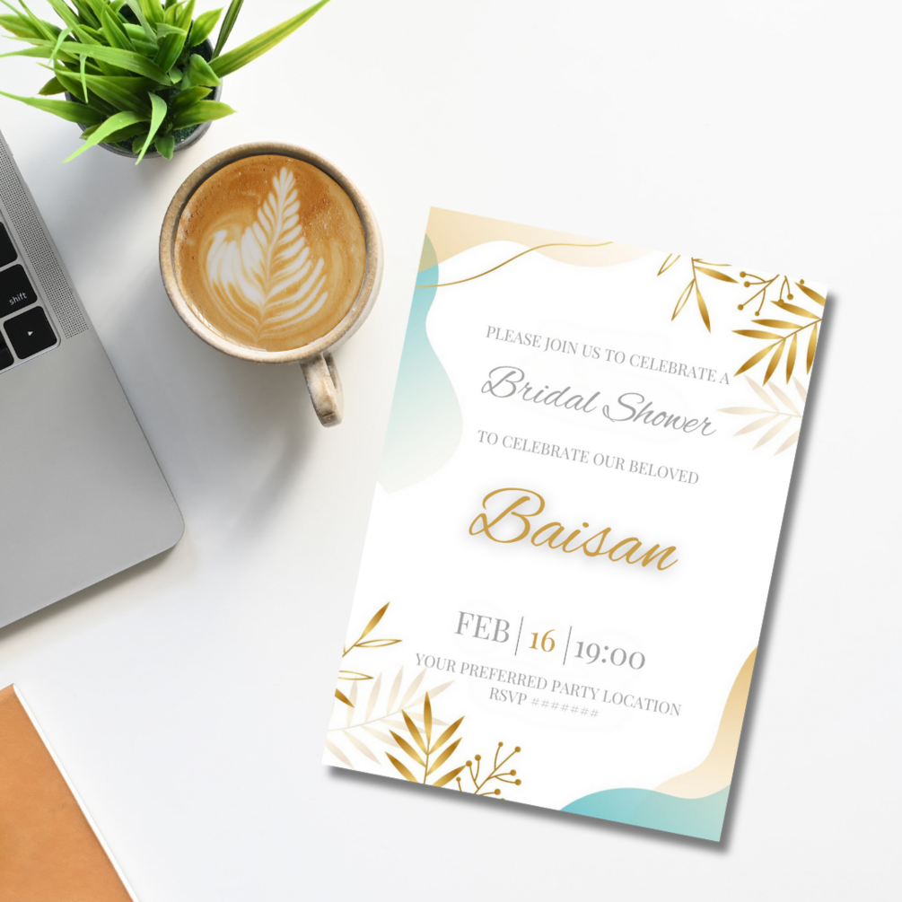 Embrace the ethereal allure of our 'Gradient Golden Luxe' Bridal Shower Canva template package. Featuring captivating turquoise hues and glistening golden tree leaves, this collection creates a heavenly atmosphere for the bride-to-be's special celebration.