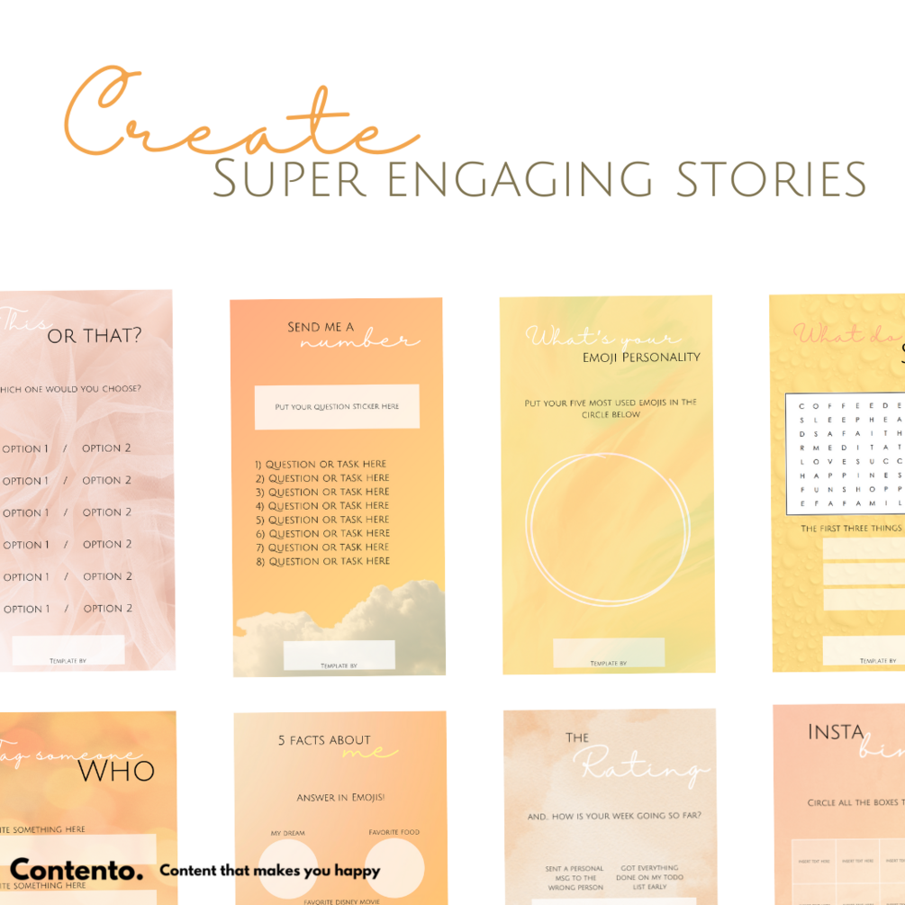Our story games templates are designed to take your Instagram engagement to the next level. With these templates, your audience will not only interact with your posts but also be encouraged to screenshot and reuse them, with your account name on them to the templates and making them go viral.