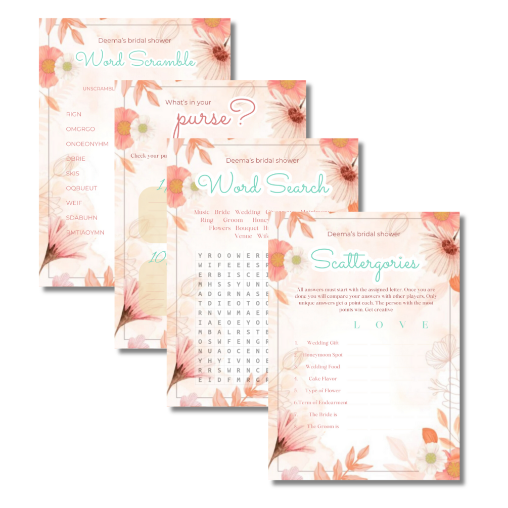 Transform your bridal shower into a whimsical affair with our 'Blushing Petals' Canva template package. Designed with the perfect blend of delicate shades of peach and pink, this all-in-one package includes beautifully crafted invitations and an array of seven customizable games to entertain your guests.